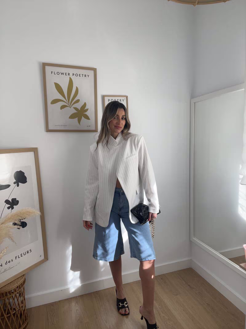 Blazer de manga larga con hombreras. Cruzada con cuello alzado y botón. Detalles de bolsillos. Diseño asimétrico. Disponible en varios colores.