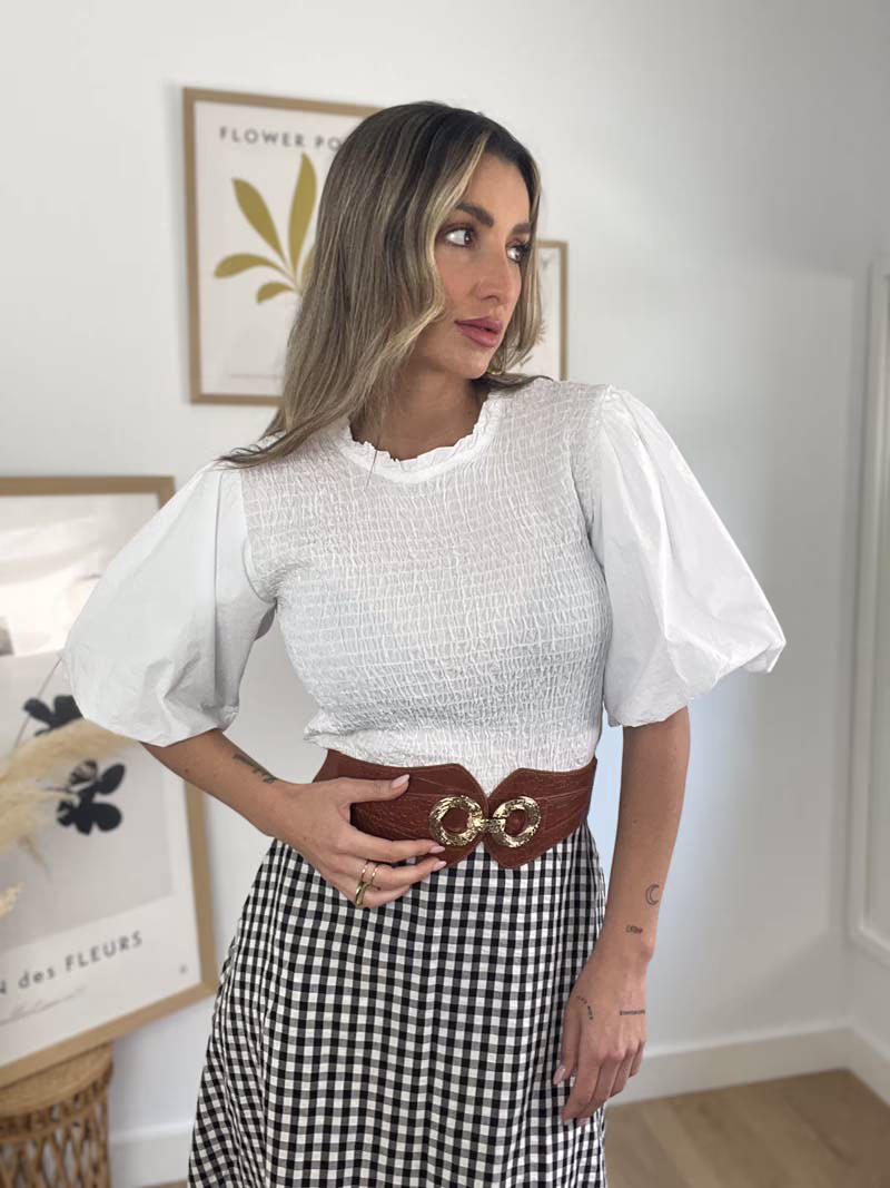 Blusa cuello a la caja, cuerpo confeccionado en textura fruncida, excepto las mangas abullonadas, cierre trasero con botón al cuello.