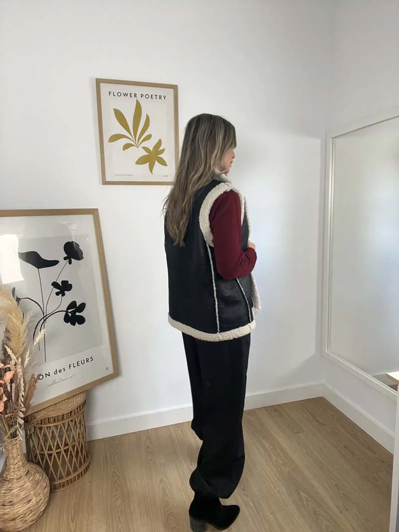 Chaleco en tejido efecto ante con interior y ribetes de borreguito suave, cuello solapa  amplio y corte recto