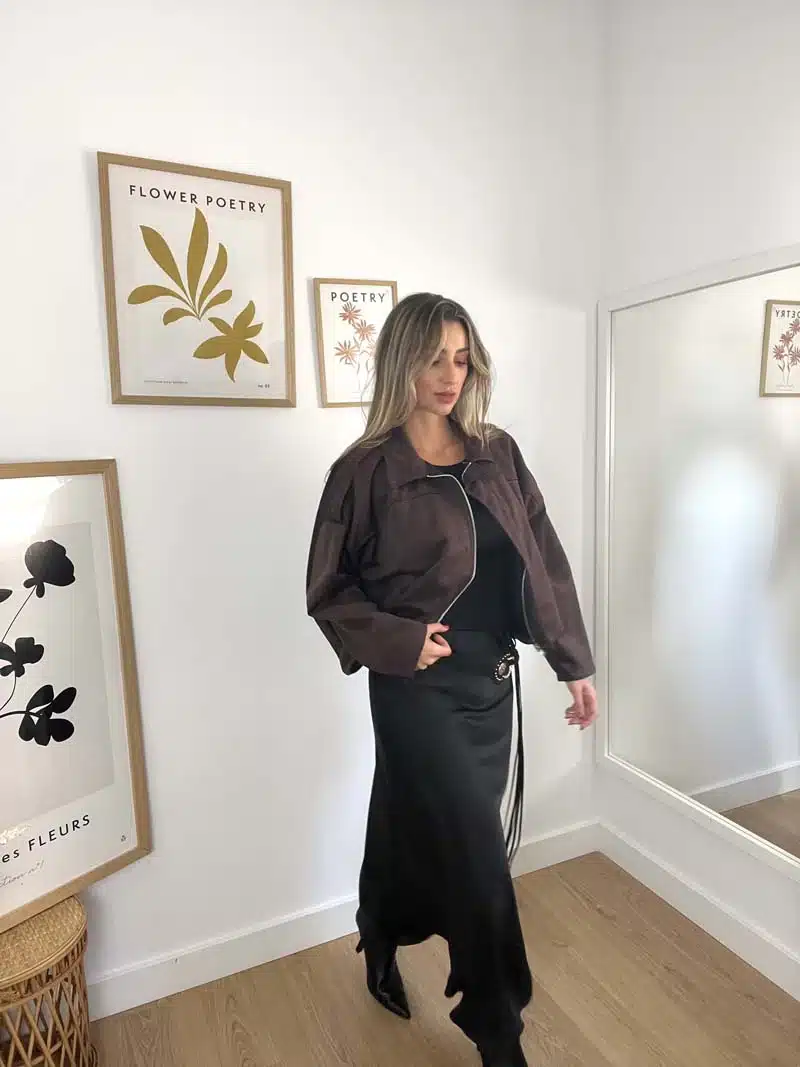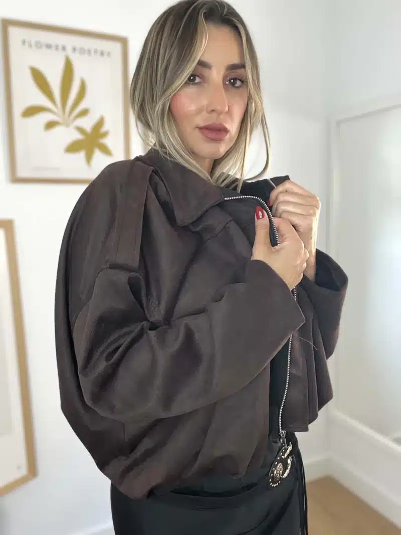 Chaqueta bomber efecto antelina, corte oversize,  con cuello solapa y manga larga con trabilla en hombro, bajo acabado con pliegues y cierre de cremallera