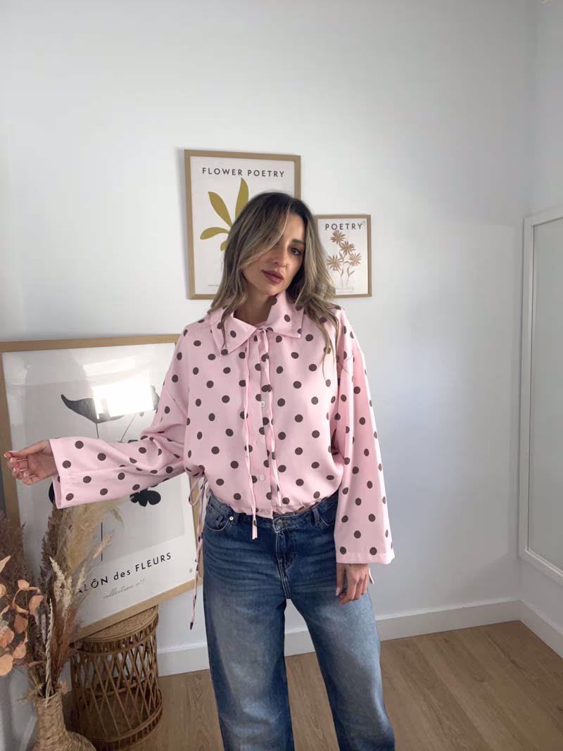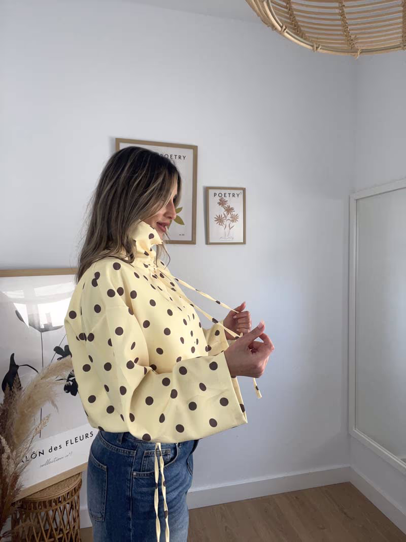 Chaqueta estampada de lunares, cierre con botones acabado en la cintura en rizo ajustables, manga larga. Disponible en varios colores.