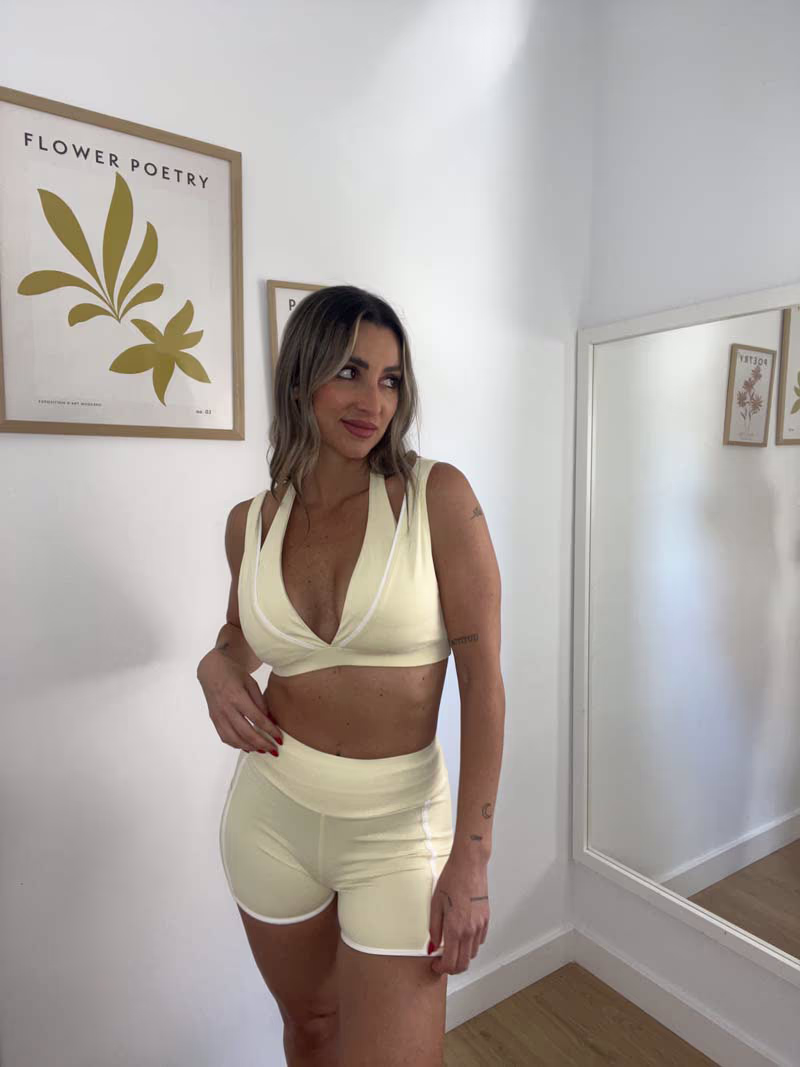 Top deportivo superposion, diseño halter al cuello con tirantes anchos y detalles en contrate blanco que realzan el escote.