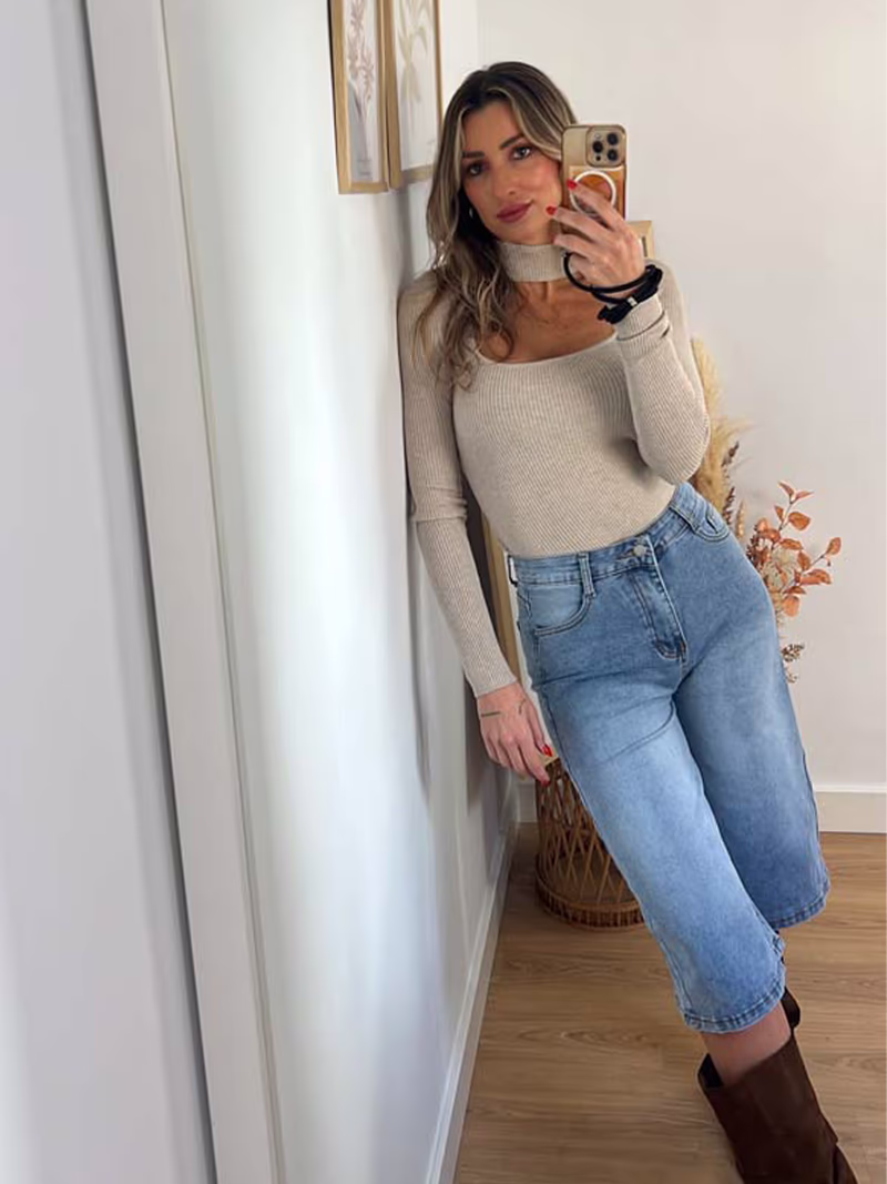 Jersey de punto fino manga larga con diseño ajustado,tejido de canalé, suave y elastico, escote cuadrado y detalle choker al cuello.