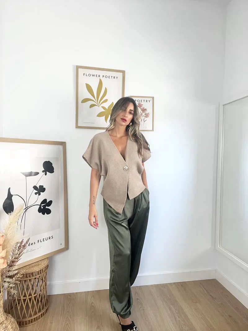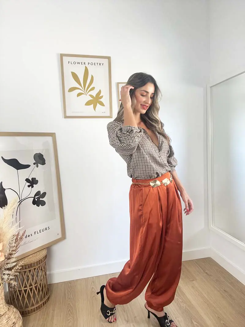 Pantalón con tejido satinado súper ligero que aporta elegancia y comodidad. La cintura trasera elástica garantiza un ajuste perfecto mientras que las pinzas delanteras estilizan la figura. Incluye bolsillos funcionales y el puño en tobillo, súper tendencia este otoño/invierno, que marca la diferencia.