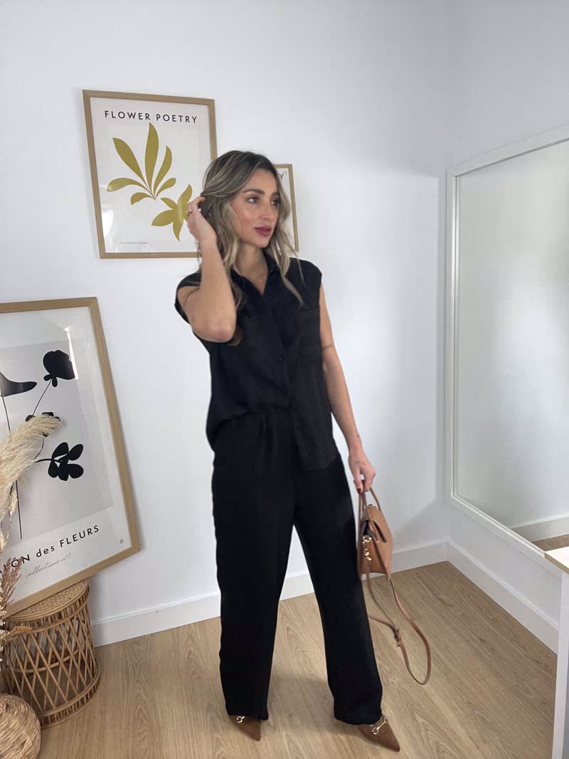 Pantalón corte recto fluido rayas verticales, cintura elastica y bolsillos. Combinar con camisa fluida rayas fluida para total look.