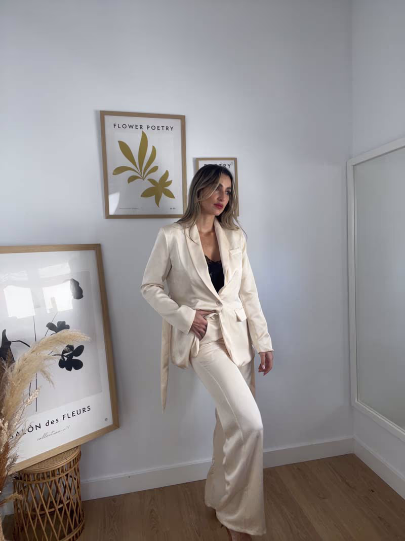 Pantalón de traje confeccionado en tejido ligero y fluido, tela satinada con un ligero efecto arrugado, cintura elástica con trabillas y cierre con botón. Disponible blazer a conjunto.
